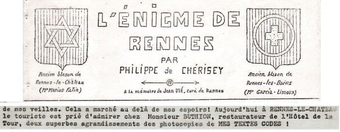 Philippe de Chérisey: Aujourd’hui à RENNES-LE-CHÂTEAU le touriste est prié d’admirer chez Monsieur BUTHION, restaurateur de l’Hôtel de la Tour, deux superbes agrandissements des photocopies de MES TEXTES CODES !