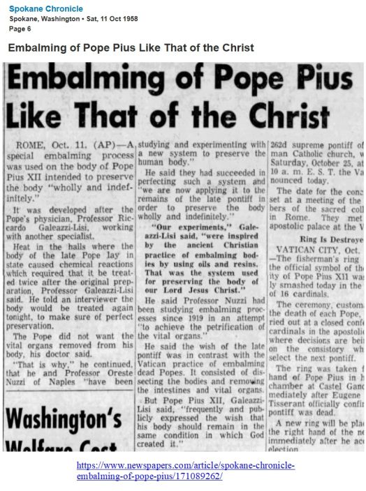 Professor Riccardo Galeazzi-Lisi “described in great detail the embalming the body of the late Pontiff (Pope Pius XII). He claimed to have used the same system of oils and resins, with which the body of Jesus Christ was preserved” – except all that people need to do is to prove the existence of the historical Jesus Christ – that only comes through a process of wishful thinking called faith! Evangelical or Secular!