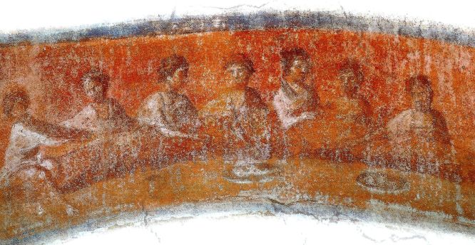 The Fractio Panis (“Breaking of Bread”) fresco, a highly significant early Christian wall painting located in the Greek Chapel (Capella Greca) of the Catacomb of Priscilla on the Via Salaria in Rome. Dating to the first half of the 2nd century (c. 100–150 AD), it is considered one of the oldest visual representations of the Eucharist. |