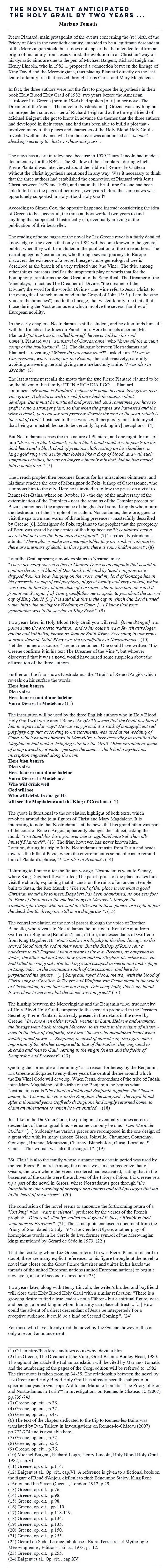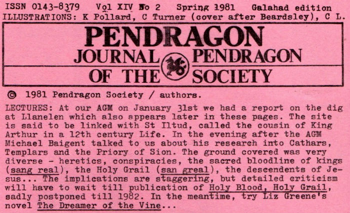 Baigent, Lincoln and Leigh took their Jesus-Bloodline nonsense on the road in a series of Lecture Tours while they were researching for the BBC Chronicle documentary “Shadow of the Templars” shown in 1979 – Liz Greene's novel was published in 1980 – therefore Liz Greene did not “anticipate” anything.