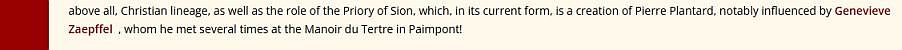 Just a reminder, that there is no evidence that Pierre Plantard ever met Genevieve Zaepffel – as claimed by the Romantic Believers, the French Webmasters, and other uncritical authors who never consult the primary sources, like for example they never even ask or consult Genevieve Zaepffel's current family for PROOF. Ask the Believers to give their sources and they will all run in the opposite direction.