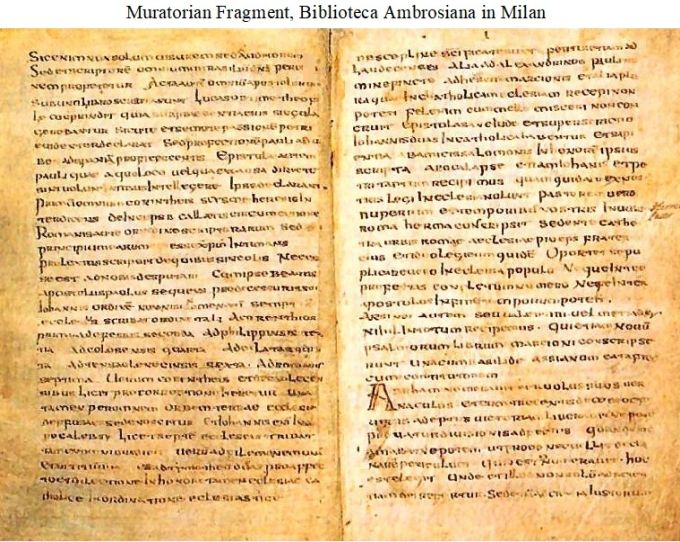 The beginning of the text is missing, though it provides crucial insight into which books early Christians considered scriptural around 170-200 CE. It's considered to be the oldest known list of New Testament books, recognizing most of the 27 books we know today. It lists the following: Matthew, Mark, Luke, John, Acts of the Apostles, I and II Corinthians, Ephesians, Phillipians, Colossians, Galatians, Romans, I and II Thessalonians, Revelation, Philemon, Titus, I and II Timothy, Jude, I and II John, one Epistle of Peter. The Wisdom of Solomon and Shepherd of Hermas is included only for private reading.