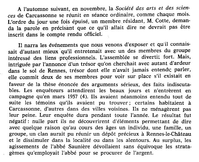 Quoting René Descadeillas: “In November 1956, Monsieur Cotte of the Société des Arts et des Sciences de Carcassonne asked the membership during its monthly session about the treasure of Rennes-le-Château, which led to an investigation of the subject matter. Two members conducted on-the-spot research in March 1957 that lasted for one year. Local historian René Descadeillas commented: “They found no evidence anywhere to support the assertion that, down the ages, any individual, family, group or clan could have accumulated a precious treasure-hoard at Rennes and then concealed it in the locality or its environs. What is more, the activities of the Abbé Saunière were undoubtedly eloquent of the sort of stratagems that he was accustomed to using in order to enrich himself” (Mythologie du Trésor de Rennes, pages 57-58, Editions Collot, 1991; reprinted from 1974).