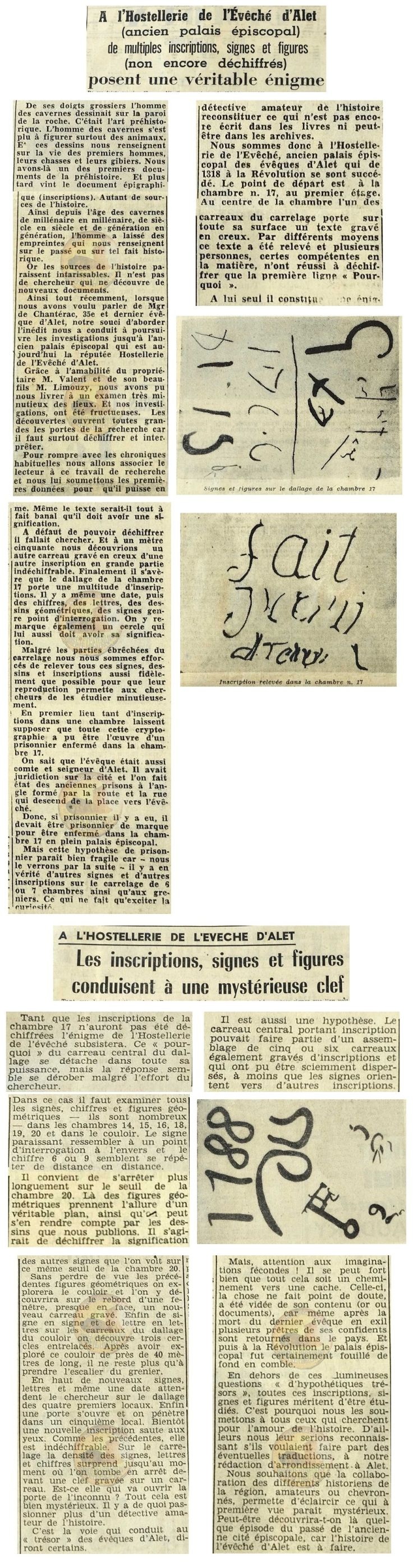 There is not simply “one treasure” – but rather “multiple treasures of Rennes-le-Château” – that can be found anywhere and everywhere – including within the pages of the Midi Libre of 3 and 4 November 1959, in a two part article entitled “A l’Hostellerie de l’Évêché d’Alet (ancien palais épiscopal)”, containing multiple inscriptions, signs and figures, undecipherable and posing a real enigma and in the second article entitled, “Les Inscriptions, signes et figures conduisent à une mystériouse clef”.