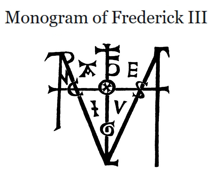 Frederick III Habsburg (1415-1493) became Frederick V, archduke of Austria in 1424. He acceded as Frederick III, Holy Roman Emperor in 1440 and was married to Eleanore of Portugal. Frederick III was the first member of the House of Habsburg to become Holy Roman Emperor. The Ruler's Signum manus, or Monogram, contained the letters of his motto, “aeiou”.